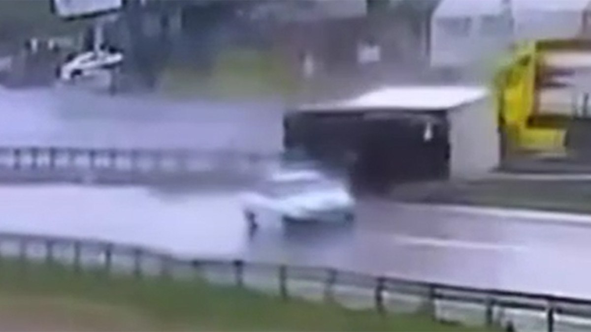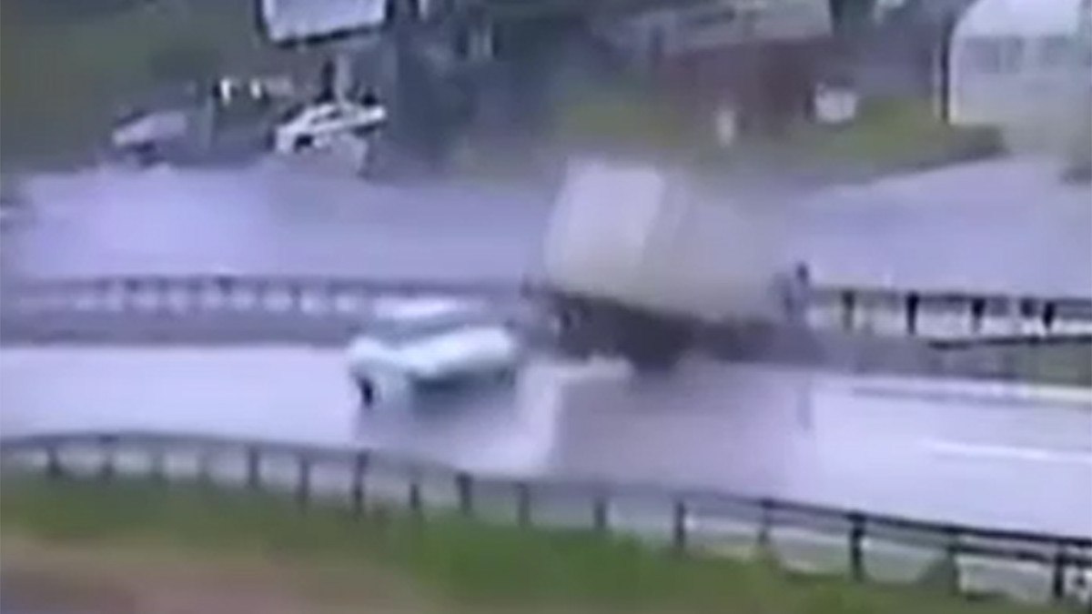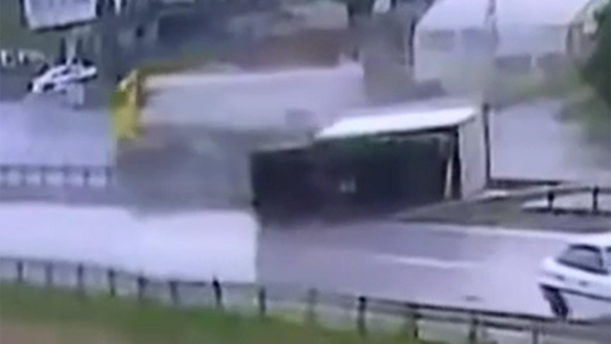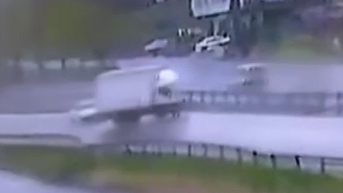 Görüntülerde şerit değiştirmek isteyen kamyonun savrulduğu ve arkasından bir otomobilin çarptığı, ardından ise kamyonun devrildiği anlar yer aldı.
