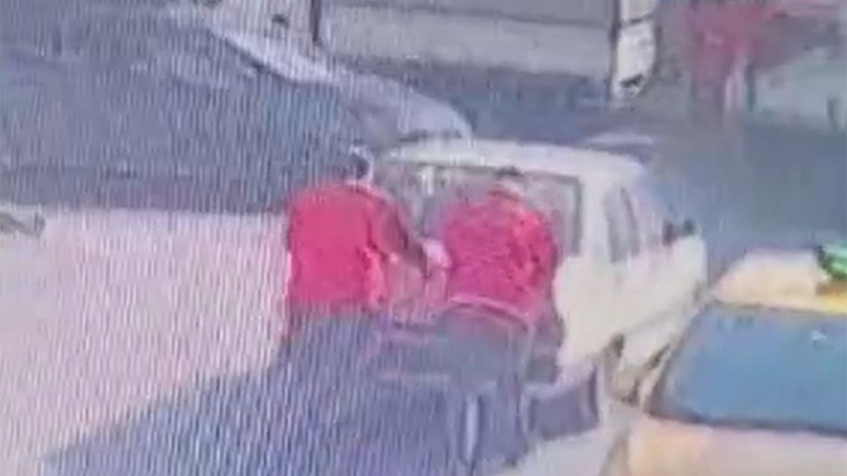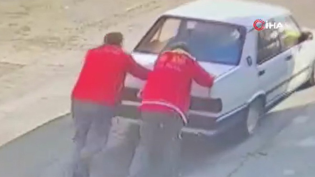 İstasyonda çalışan iki pompa görevlisi otomobili itmeye başladı.