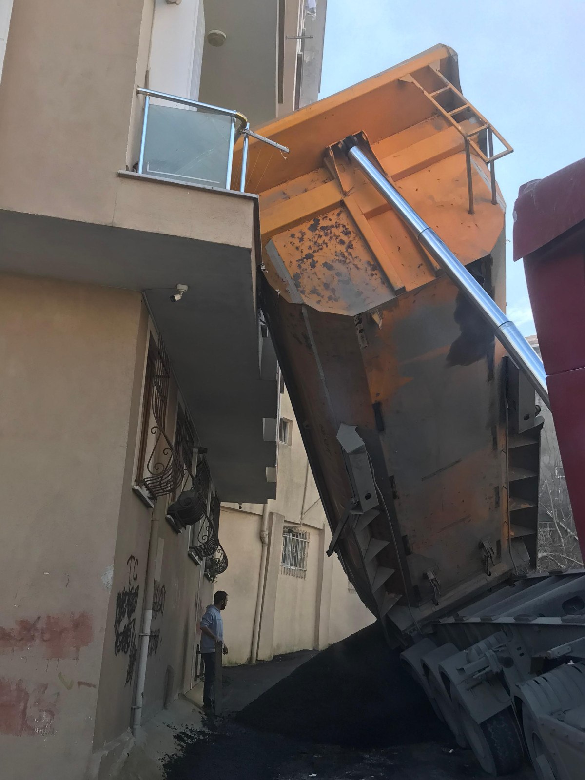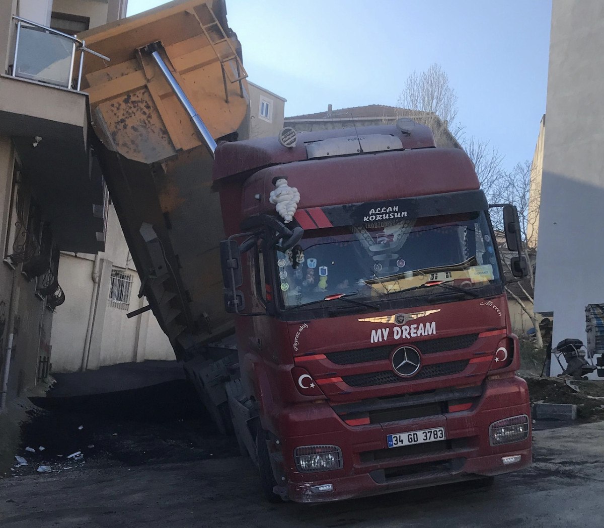 Kağıthane içesine bağlı Nurtepe Mahallesi’ndeyol çalışması için asfalt dolu olan 34 GD 3783 plakalı hafriyat kamyonuyla sokağa gelen sürücü, damperi kaldırmaya başladı.