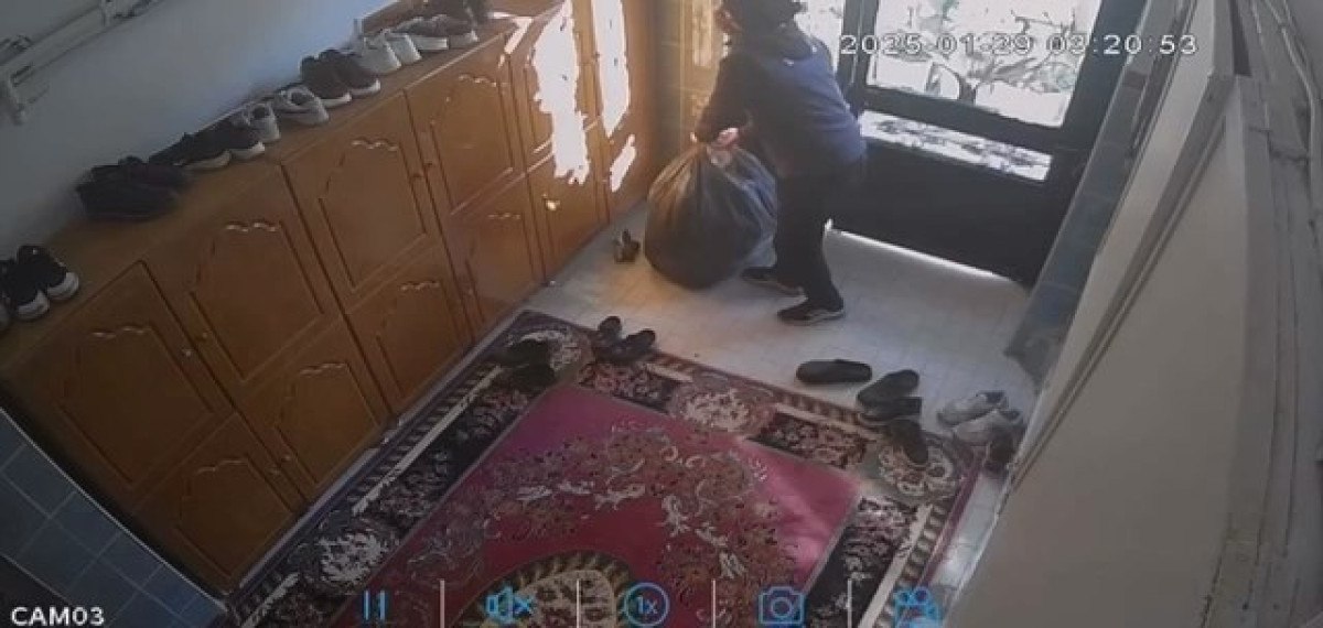 Cadde üzerindeki bir apartmanın kapısından içeri giren kimliği belirsiz bir kişi, buradaki ayakkabıları yanında getirdiği büyük poşete koymaya başladı.