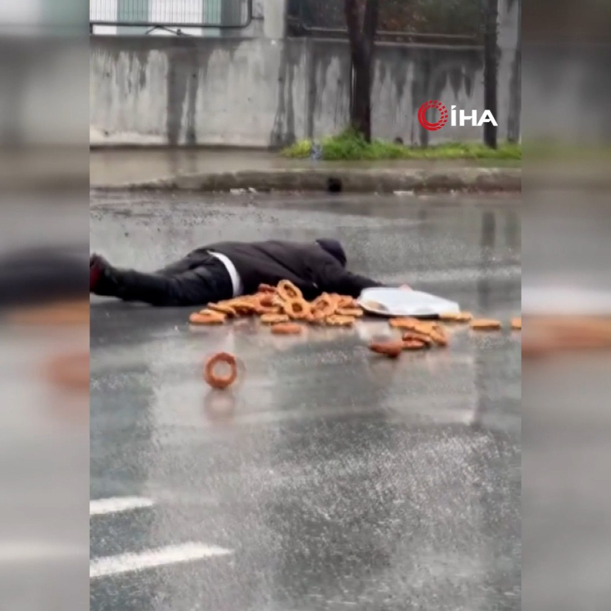Duygu sömürüsü yapan şahıs, kendini bir anda yere atarken tepsisinde taşıdığı simitler yere saçıldı.
