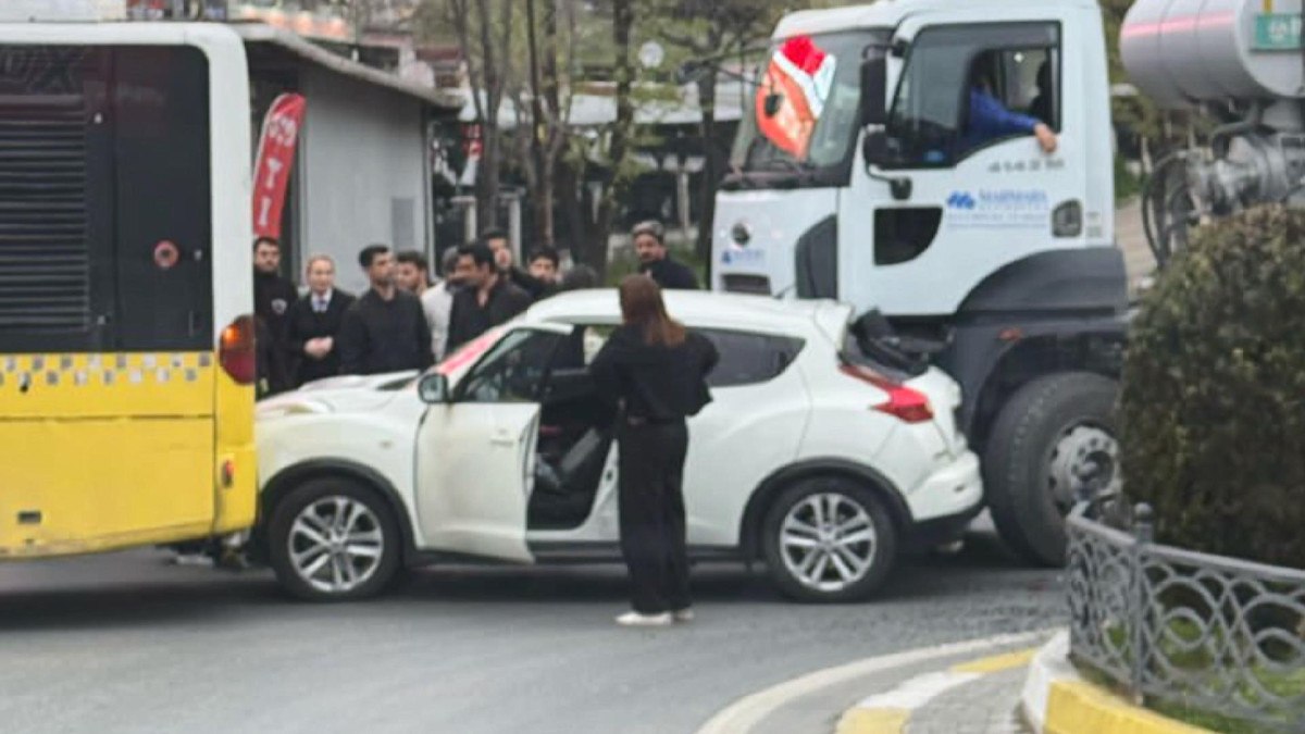 Çarpmanın şiddetiyle otomobil sürüklenerek durakta bekleyen otobüsle beton mikseri arasında sıkıştı.