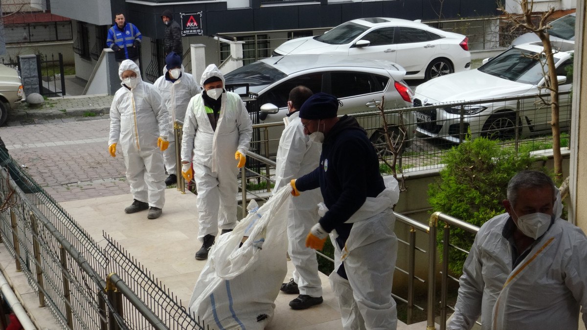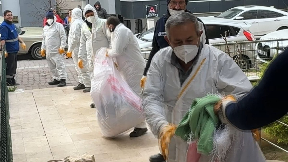 Çok sayıda farenin yanı sıra bit ve pire bulunan çöp evdeki tüm eşyalar özel kıyafet giydirilen ve iki maske taktırılan işçiler tarafından çöp aracı ve kamyona taşındı.