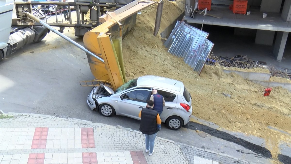 O sırada sokakta seyir halinde olan otomobilin üzerine kamyonun dorsesi devrildi.