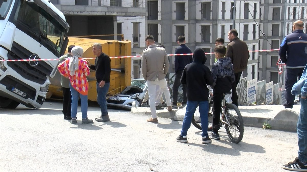 Hafriyat kamyonunun şoförü inşaata kum dökmek için dorseyi kaldırdığı sırada kamyon yan yattı.