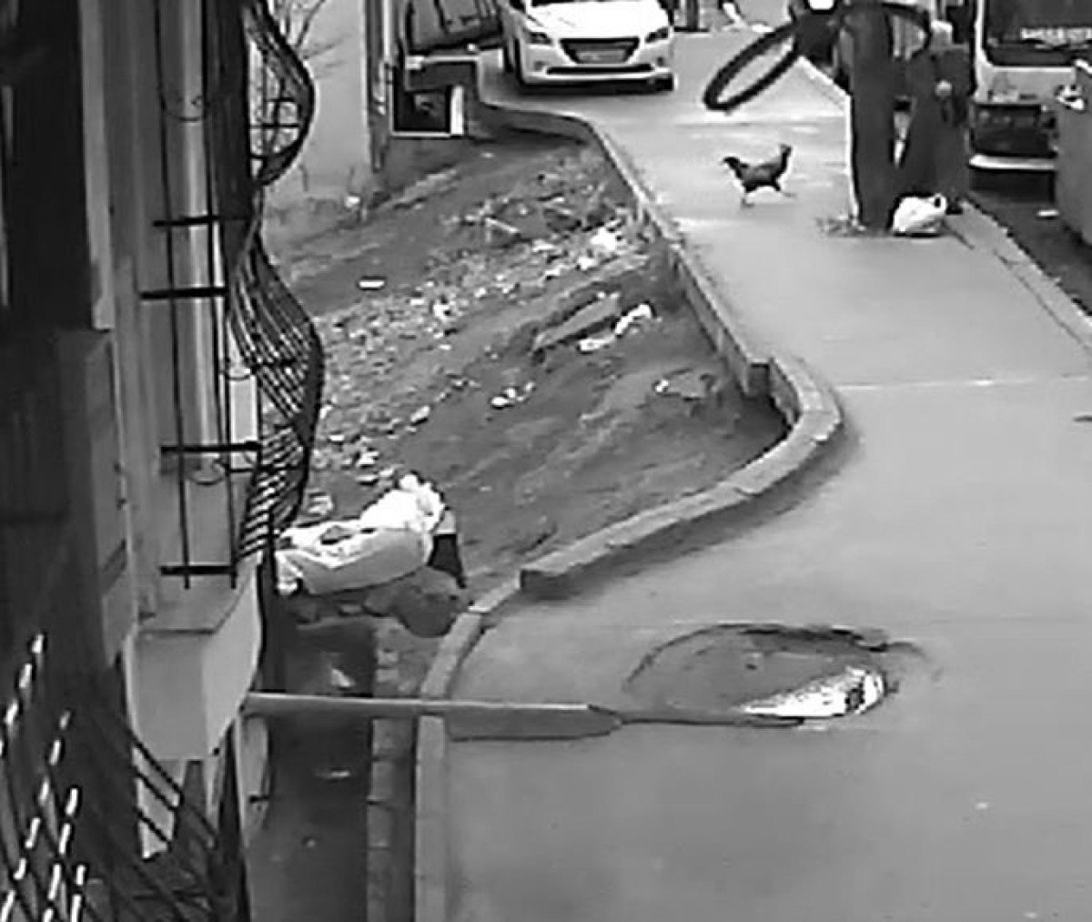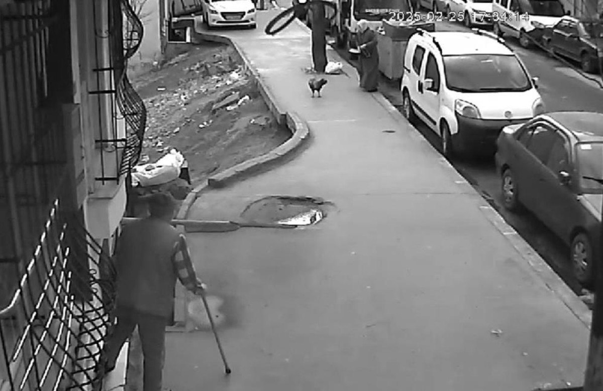 Taş ve tekme ile uzun süre horozu kovmaya çalışan kadının o anları ise güvenlik kamerasına yansıdı.