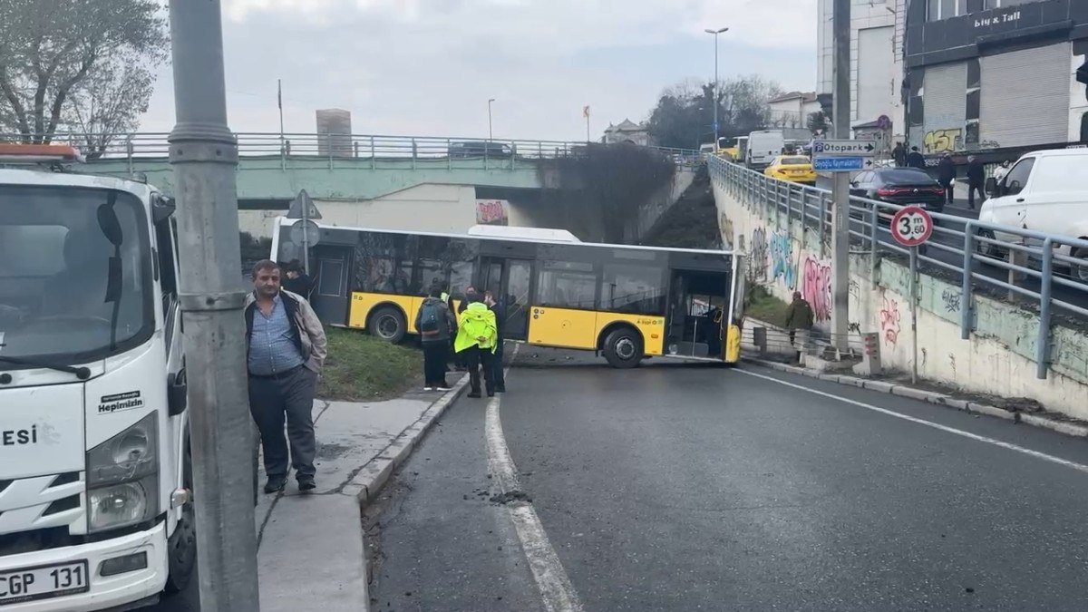 Karaköy’de yağış sonrası şoförünün direksiyon hakimiyetini kaybettiği İETT otobüsü kayarak refüjü aştı.