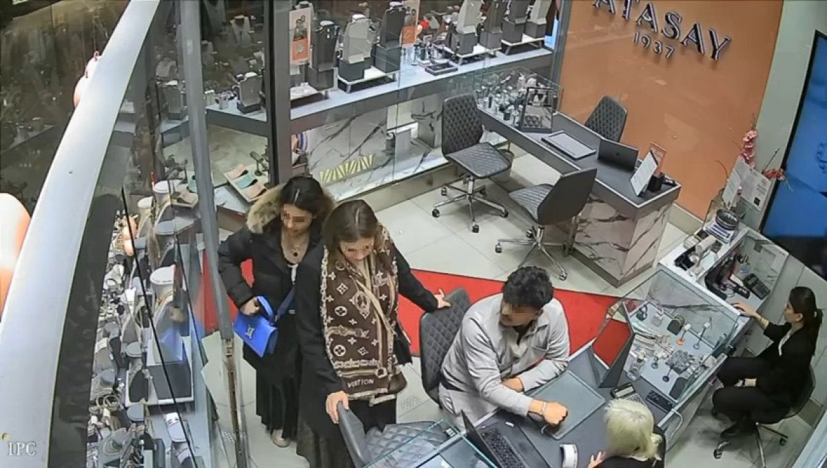 İstanbul Ümraniye’de geçtiğimiz günlerde bir alışveriş merkezinde bulunan kuyumcu dükkanına giren hırsızlardan biri sandalyeye oturup çalışan ile konuşurken iki kadın hırsız da ayakta bekledi.