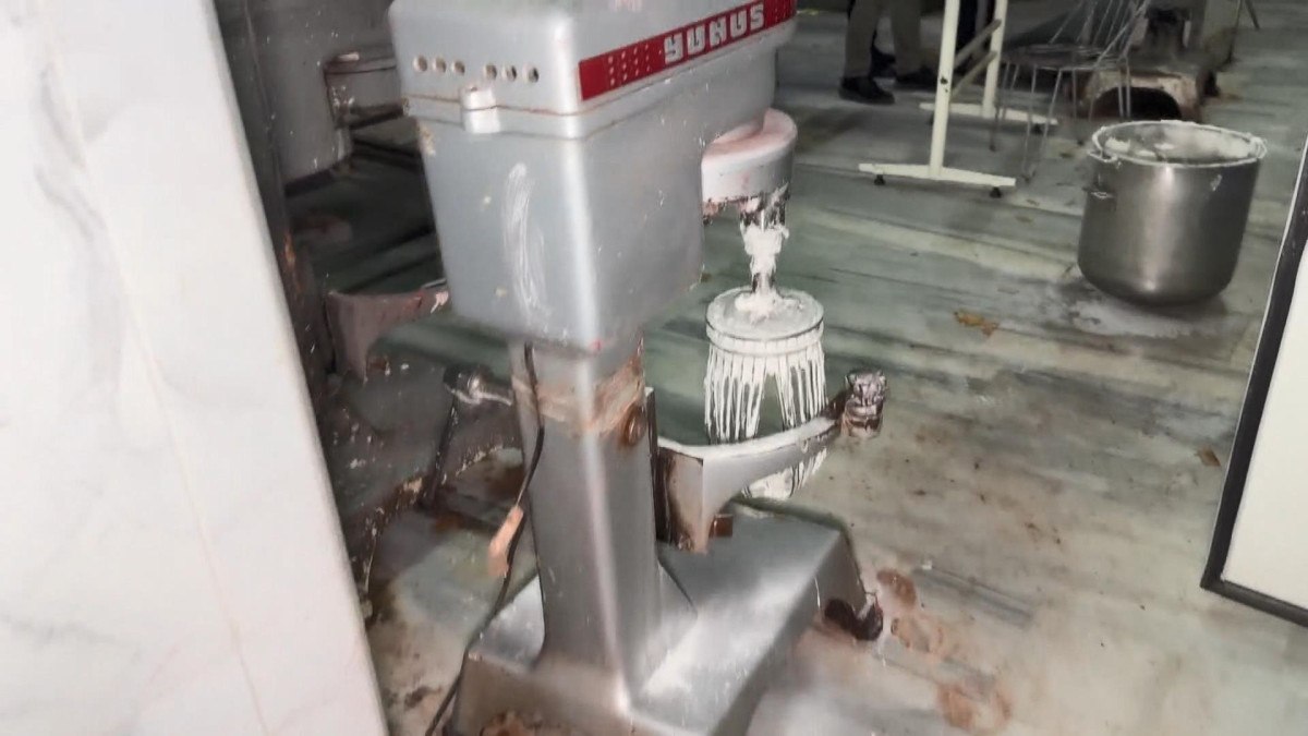Hiçbir hijyen koşuluna uyulmadan merdiven altı üretim yapıldığı belirlenen iş yerinde düğün pastalarının paslı ve kirli aletlerle hazırlandığı, soğutucu olarak hazırlanan dolaplarda hijyen kurallarına uyulmadığı saptandı.
