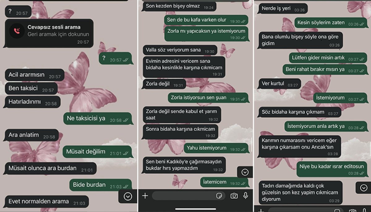 Mesajlarda kadına karşı ısrarcı bir kullandığı görülen taksicinin, mağdur kadına karşı ahlaksız teklif sunduğu görülüyor.