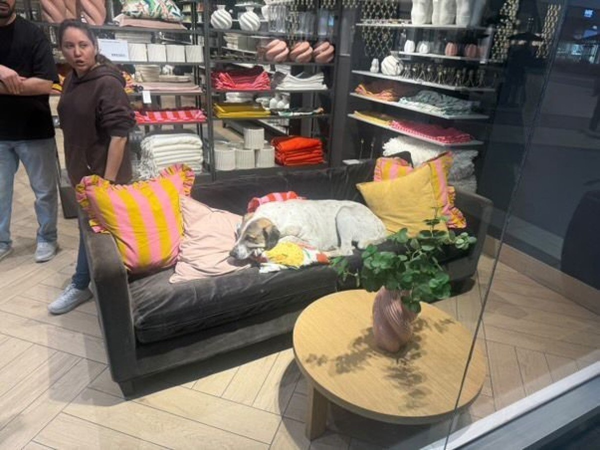 Bu esnada Elif Dua, mağaza girişindeki koltukta bulunan köpeğin yanına gitti.