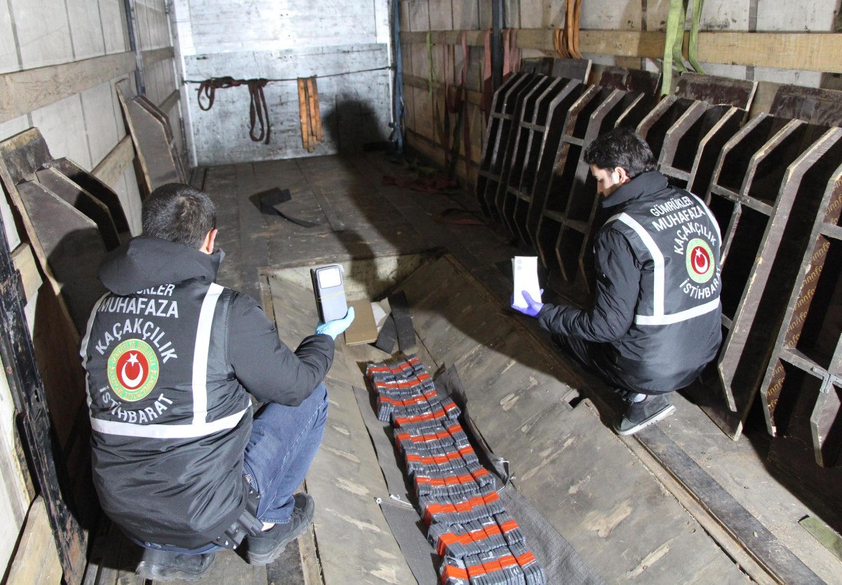 Aramada, tırın dorsesinde özel oluşturulan ve ‘havuz dorse’ olarak tabir edilen özel düzenekte 850 cep telefonu, 755 cep telefonu kılıfı ele geçirildi.