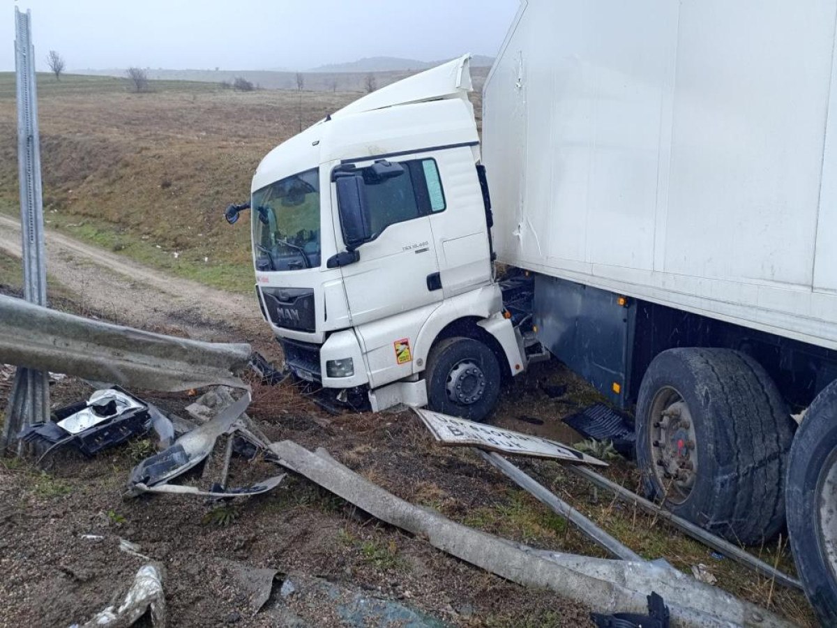 Karabük’ün Eskipazar ilçesinde Bolu’nun Gerede ilçesi istikametinden Çankırı’nın Çerkeş ilçesi istikametine seyir halindeyken kayganlaşan yolda kontrolden çıkan L.A yönetimindeki Gürcistan plakalı tır makaslayarak bariyerlere çarptı.