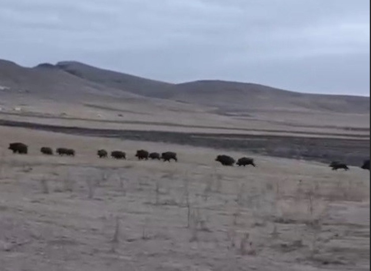 Kars’ta havaların soğumasıyla birlikte yiyecek bulmakta zorlanan domuz sürüsü Selim ilçesine bağlı Koşapınar köyüne kadar indi.