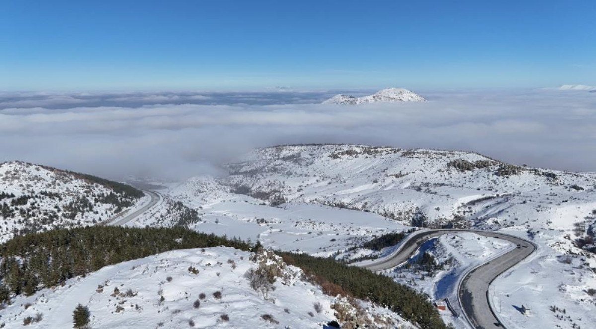 Kar yağmasıyla birlikte yeşil ile beyazın buluştuğu kıvrımlı Erciyes yolu da drone ile görüntülenirken, sisler arasından 2 bin metre yükseklikteki zirvesini çıkaran Ali Dağı da Erciyes’ten şehir merkezine inen vatandaşları selamladı.