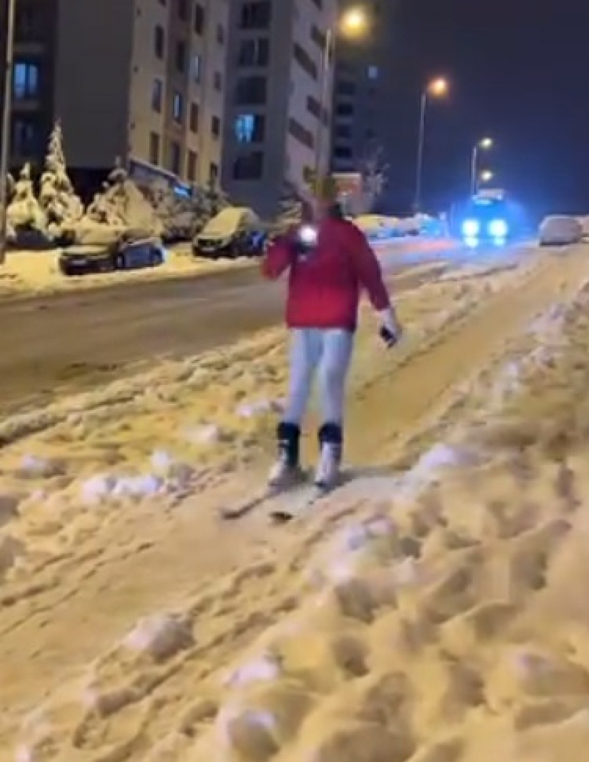 Yılmaz, karla kaplanan kaldırımlarda kayak yapmanın keyfini çıkardı. O anlar Yılmaz’ın arkadaşı tarafından kaydedildi.