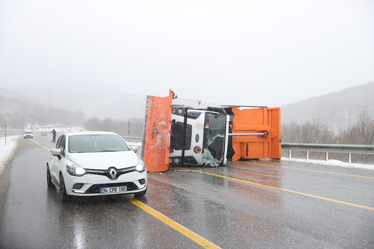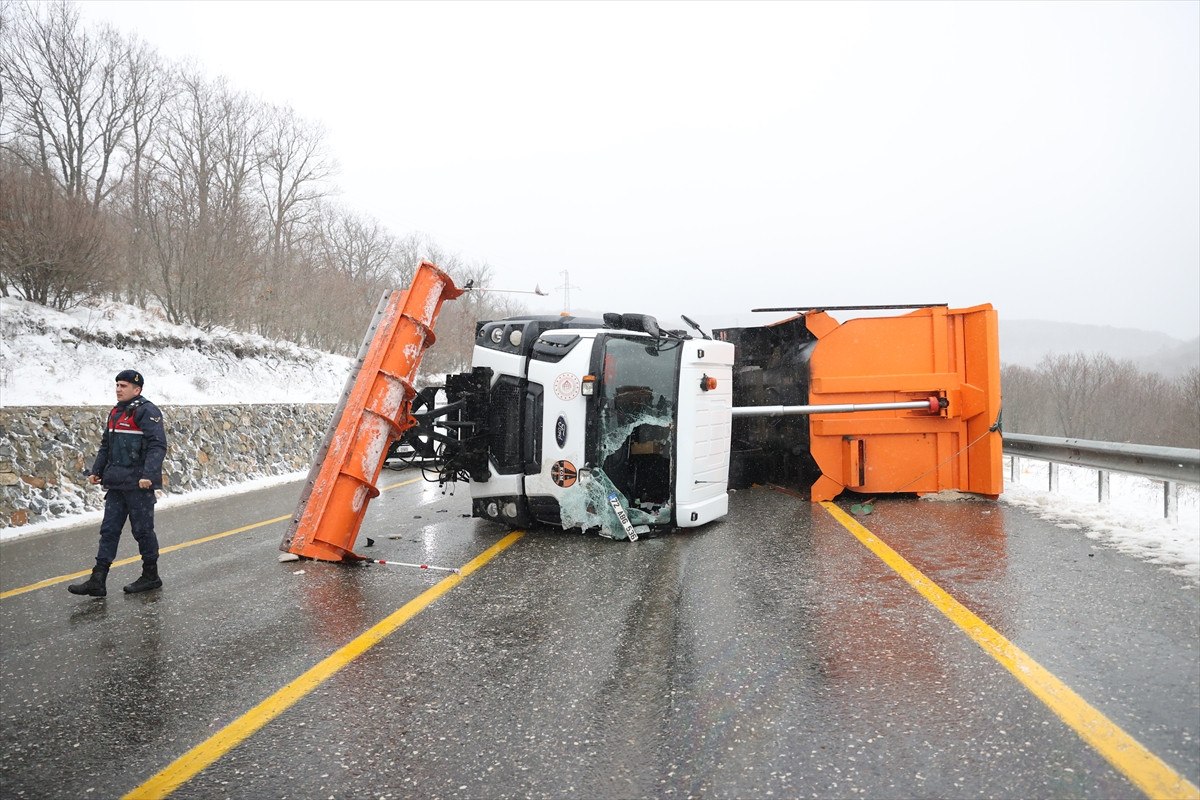 KAR KĞREME ARACI DEVRİLDİ: 2 YARALI