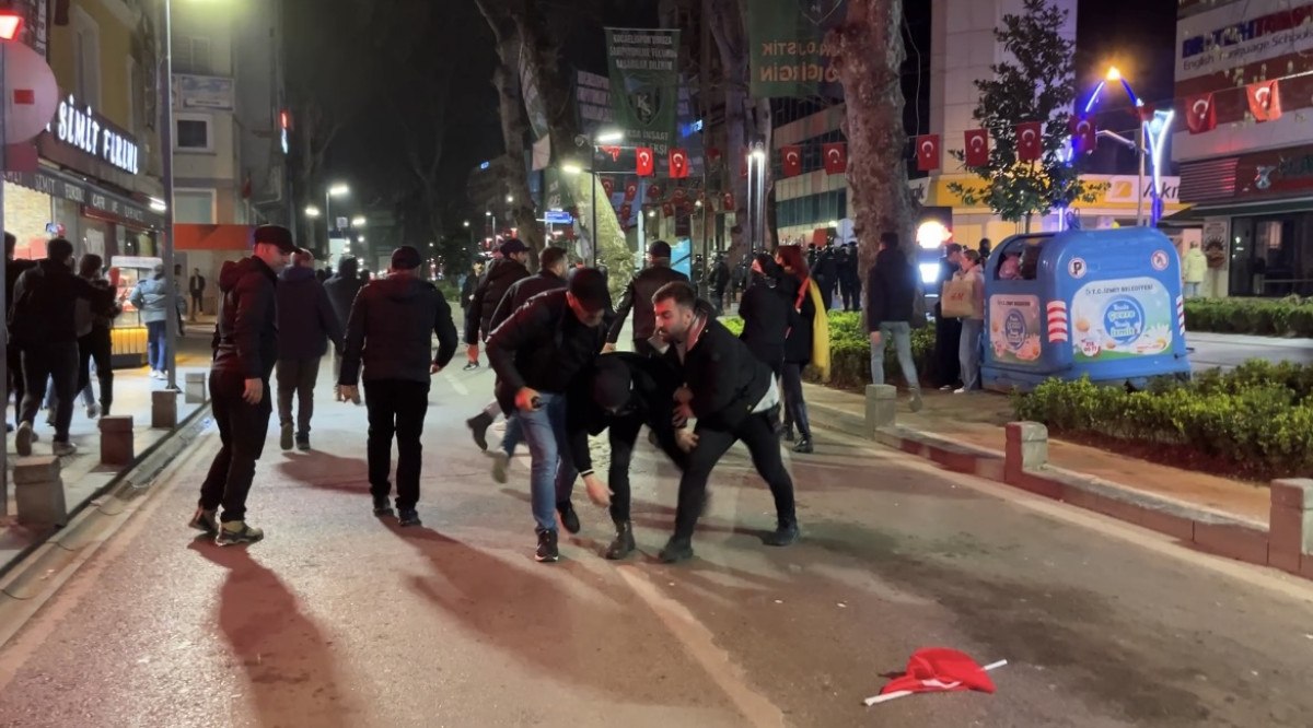 Öte yandan yapılan gözaltı işlemi sırasında polis, protestoculardan düşen Türk bayrağını alıp, başka bir polise verdi.