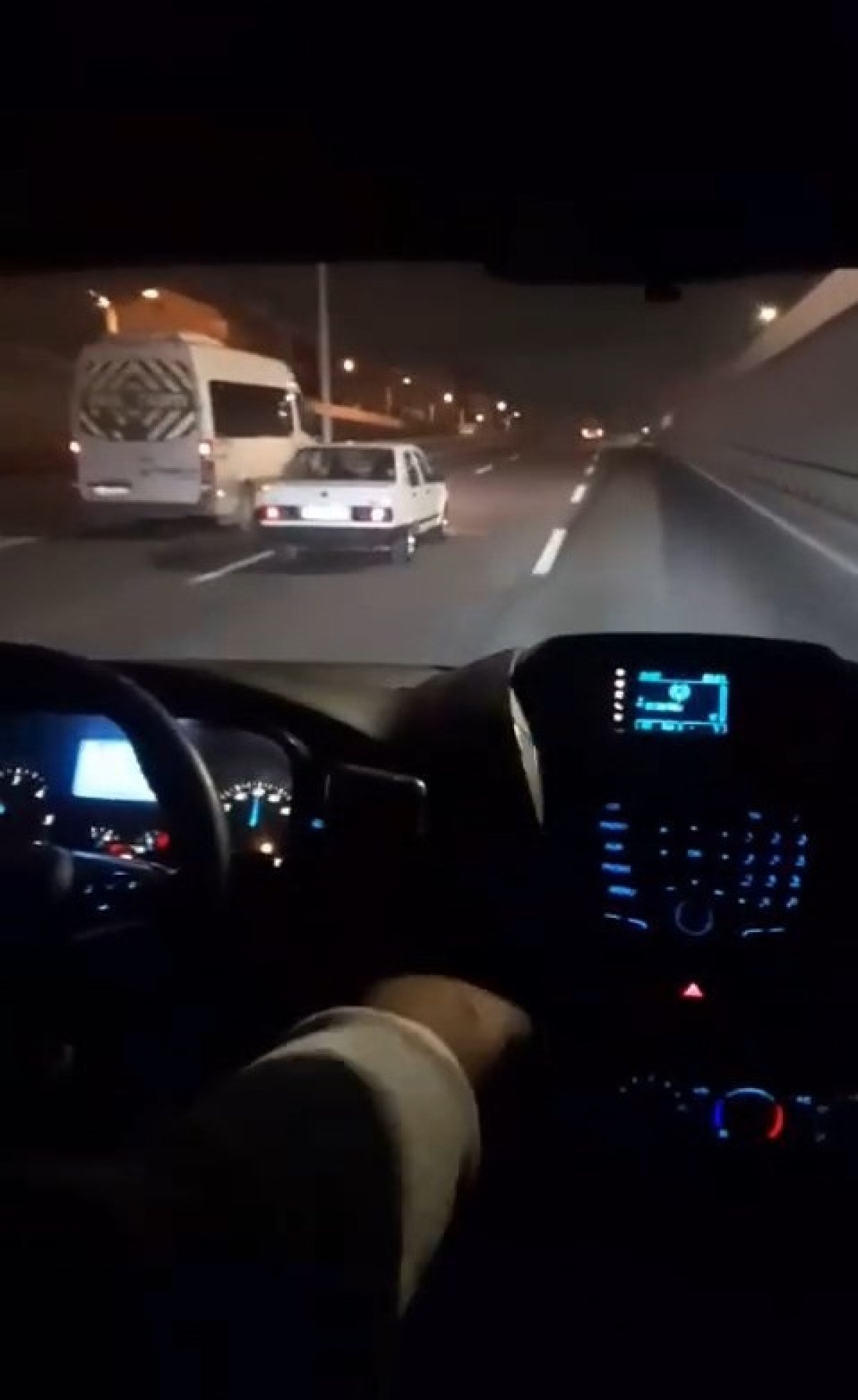 Görüntüde servis minibüslerinin otomobilin önüne kırdığı, otomobil içindeki panik anları yer aldı.