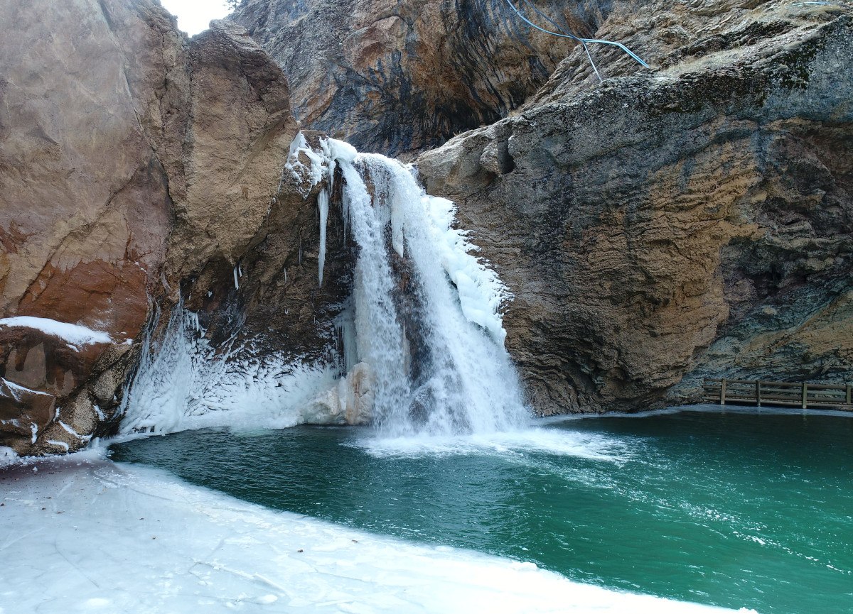 Konya’nın Taşkent ilçesi Çetmi Mahallesi Ayı Boğazı mevkiinde bulunan Çetmi Şelalesi, hava sıcaklığı eksi 18 dereceye kadar düşünce dondu.