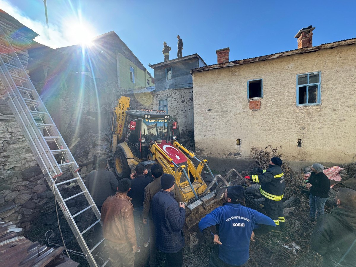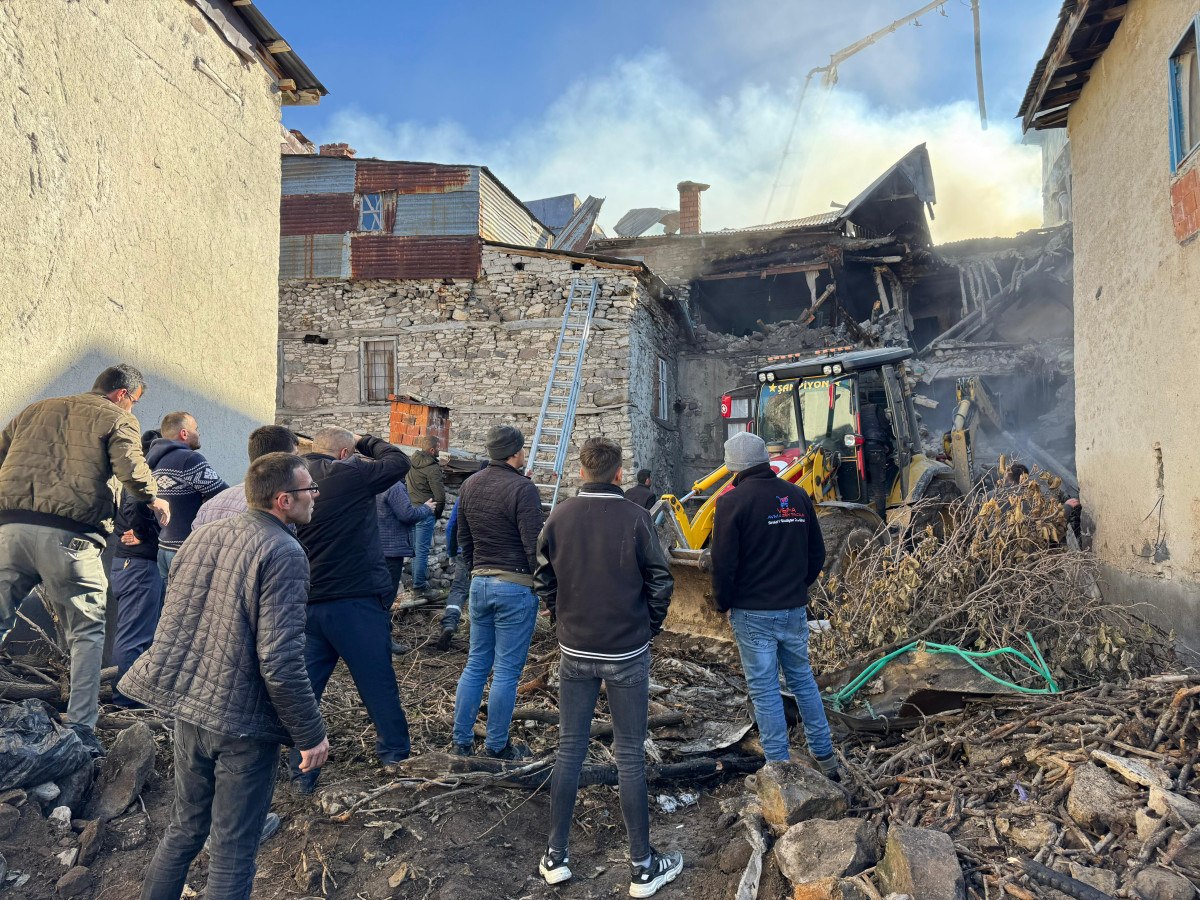 Alevler itfaiye ekipleri tarafından söndürülürken, kerpiç olan 4 evden 2’sinin iş makineleri ile yıkılması çalışma başlatıldı.