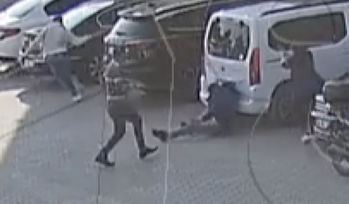 Aldığı ilk darbeyle yere düşen D.P.’nin yardımına koşan eşi, onu darbelerden kurtarmak istediği esnada 7 yaşındaki kızı da kameraya yansıdı.
