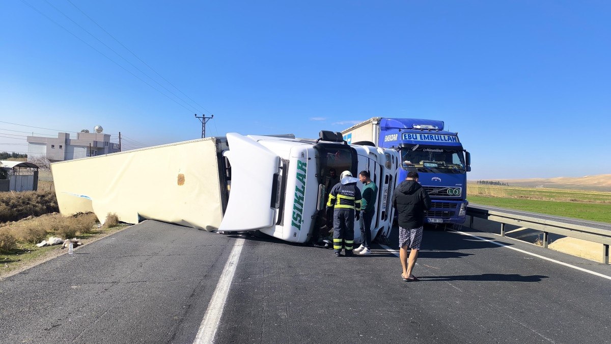 Mardin’in Nusaybin ilçesi Yolbilen Mahallesi’nde sürücüsünün direksiyon hakimiyetini kaybetmesi sonucu peynir yüklü tır devrildi.