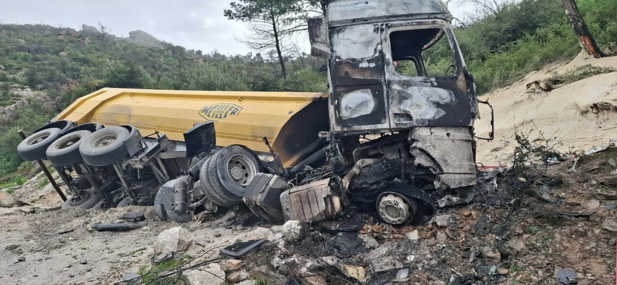 Muğla’nın Milas-Labranda yolu Kargıcak Mahallesi mevkiinde bir enerji ve maden firmasına ait Mahmut Bulut yönetimindeki hafriyat kamyonu, sürücüsünün kontrolünü yitirmesi sonucu yol kenarına devrilip, alev aldı.
