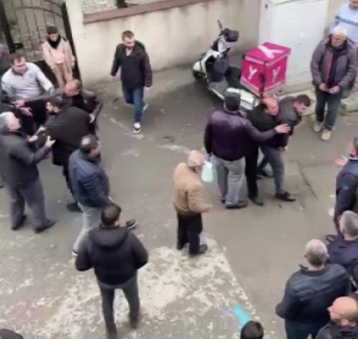 Tartışmanın büyümesiyle cemaatte bulunan vatandaşlar ile moto kurye birbirlerine girdi.