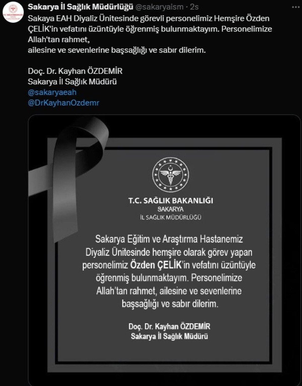 Sakarya İl Sağlık Müdürü Doç. Dr. Kayhan Özdemir sosyal medya hesabı üzerinden yayınladığı başsağlığı mesajında, “Sakarya SEAH Diyaliz Ünitesinde görevli personelimiz Hemşire Özden Çelik’in vefatını üzüntüyle öğrenmiş bulunmaktayım. Personelimize Allah’tan rahmet, ailesine ve sevenlerine başsağlığı ve sabır dilerim” ifadelerine yer verdi.
