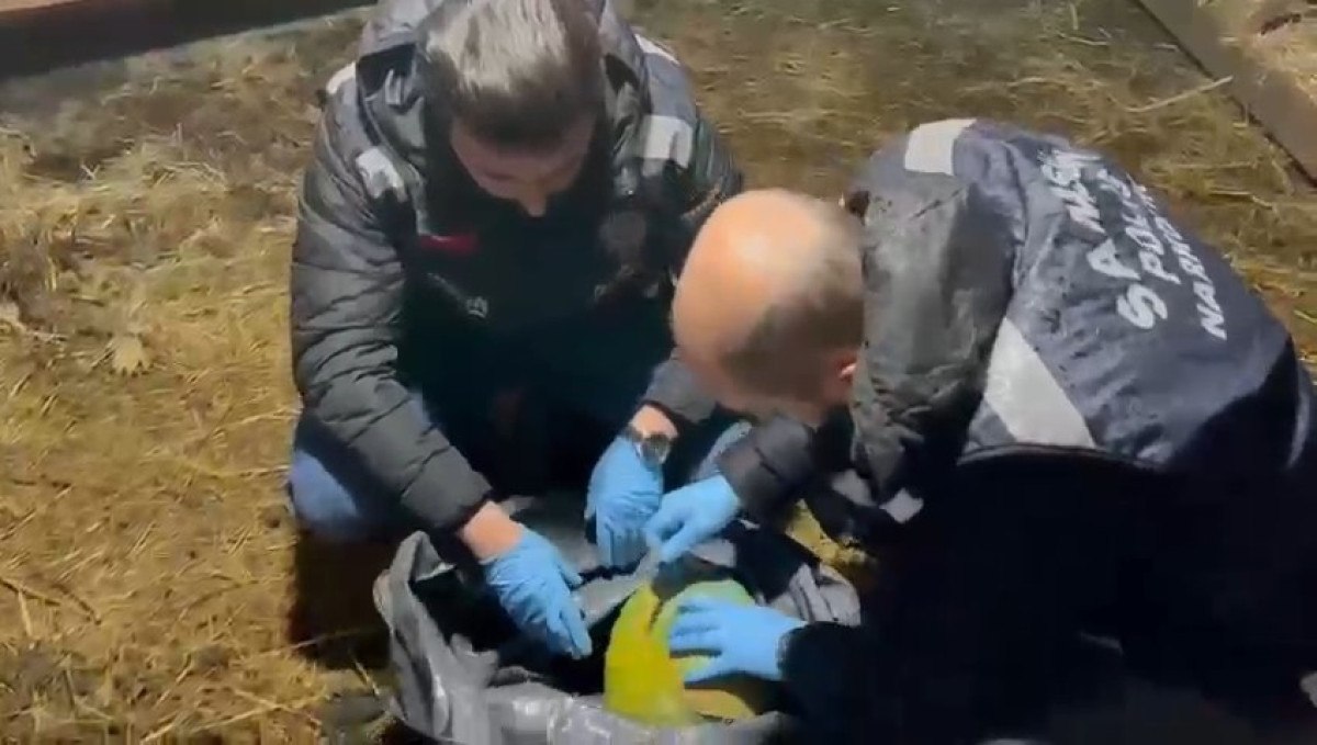 Çiftlik evde tavuk kümesi içine gizlenmiş 13 paket halinde 1 kilo 400 gram esrar, 1 ruhsatsız tabanca, 1 kurusıkı tabanca, 14 adet tabanca fişeği ve 43 kurusıkı fişeği ele geçirildi.