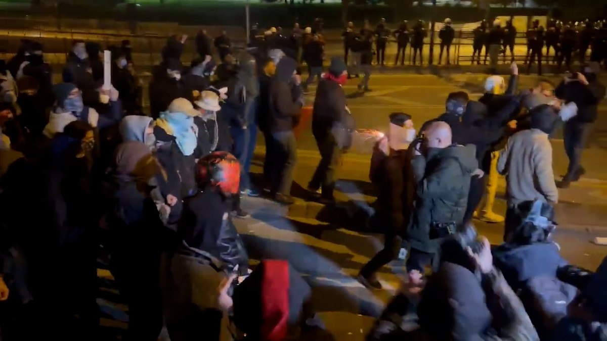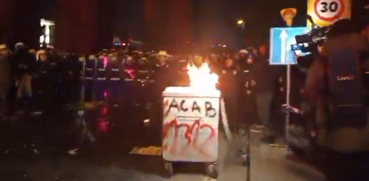 Tansiyonun yükselmesiyle birlikte protestocu gruptan bazı kişiler, yüzlerinde maske olduğu halde polise meşale, su şişesi ve tahta parçaları fırlattı. Güvenlik güçleri ise biber gazı kullanarak grubu dağıtmaya çalıştı. Yaşanan kısa süreli arbedenin ardından göstericiler, ara sokaklara çekilirken polis bölgede güvenliği sağlamaya devam etti.