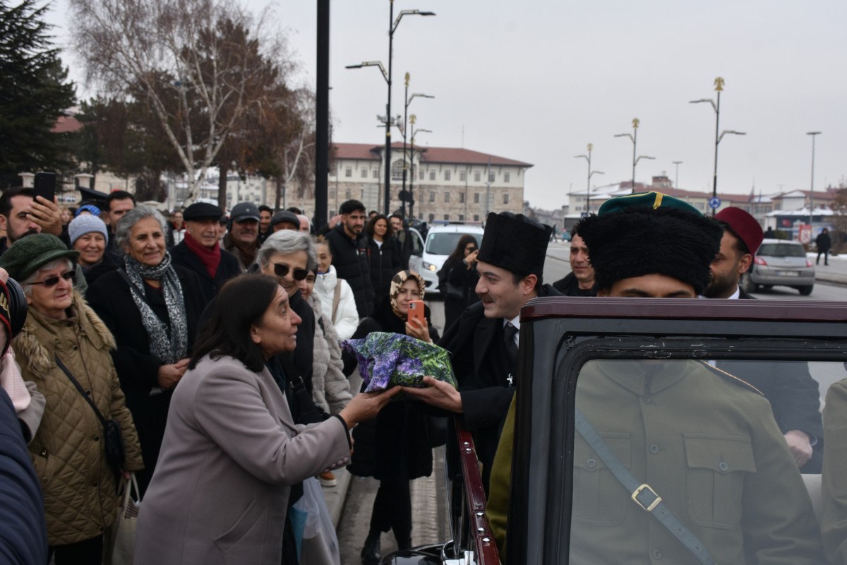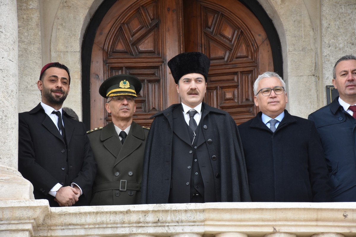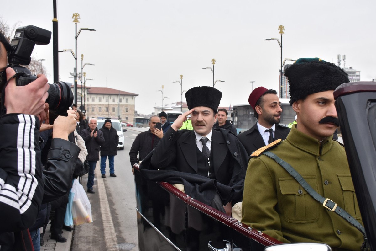 Atatürk’ü canlandıran Sivas Devlet Tiyatrosu sanatçısı Abdulsamet Sünbül ve il protokolü, müze balkonundan halkı selamladı. Daha sonra oyuncu, o dönemlerden bir araca binip, halkı selamlayarak Ankara’ya doğru hareket etti.