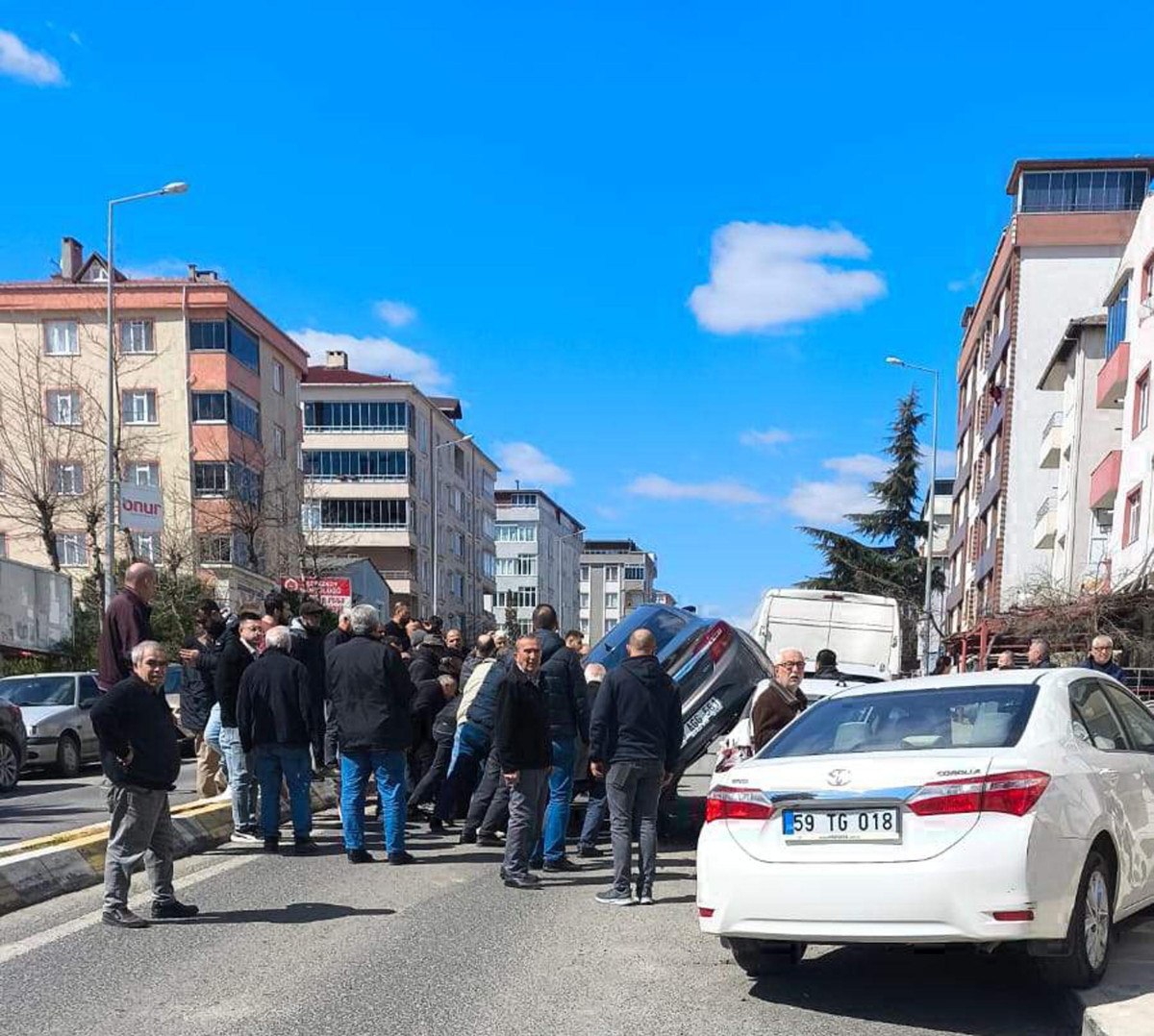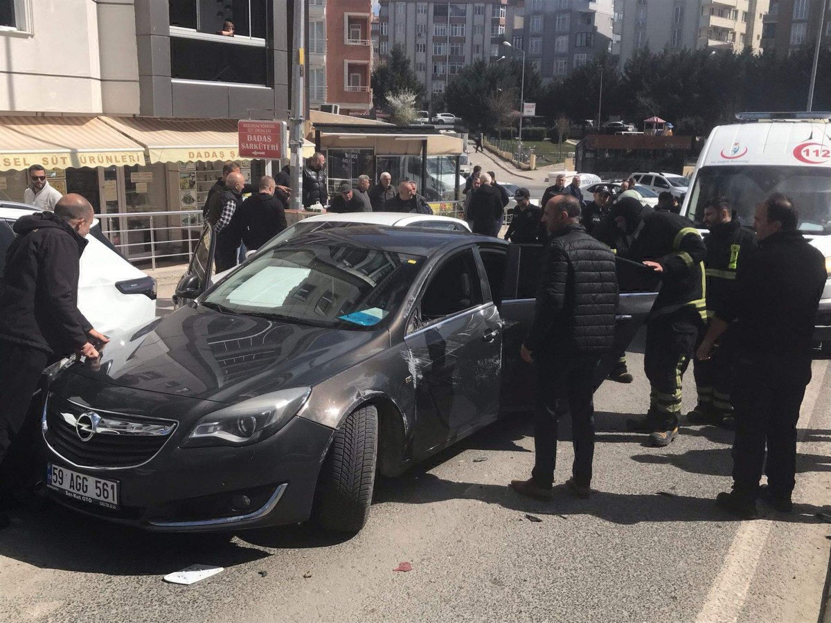 Tekirdağ’ın Çerkezköy ilçesinde Gazi Osmanpaşa Camisi kavşağında meydana gelen trafik kazasında, sürücüsünün kontrolünden çıkan otomobil, park halindeki üç araca çarptıktan sonra yan yattı.