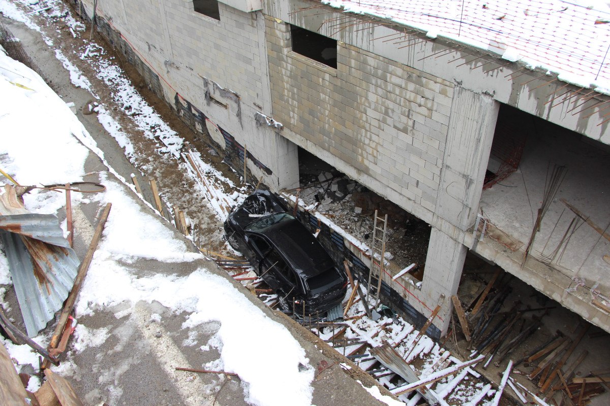 Buzlanan yolda sürücüsünün direksiyon hakimiyetini kaybetmesi sonucu otomobil, inşaat halindeki bir binanın zeminine düştü.