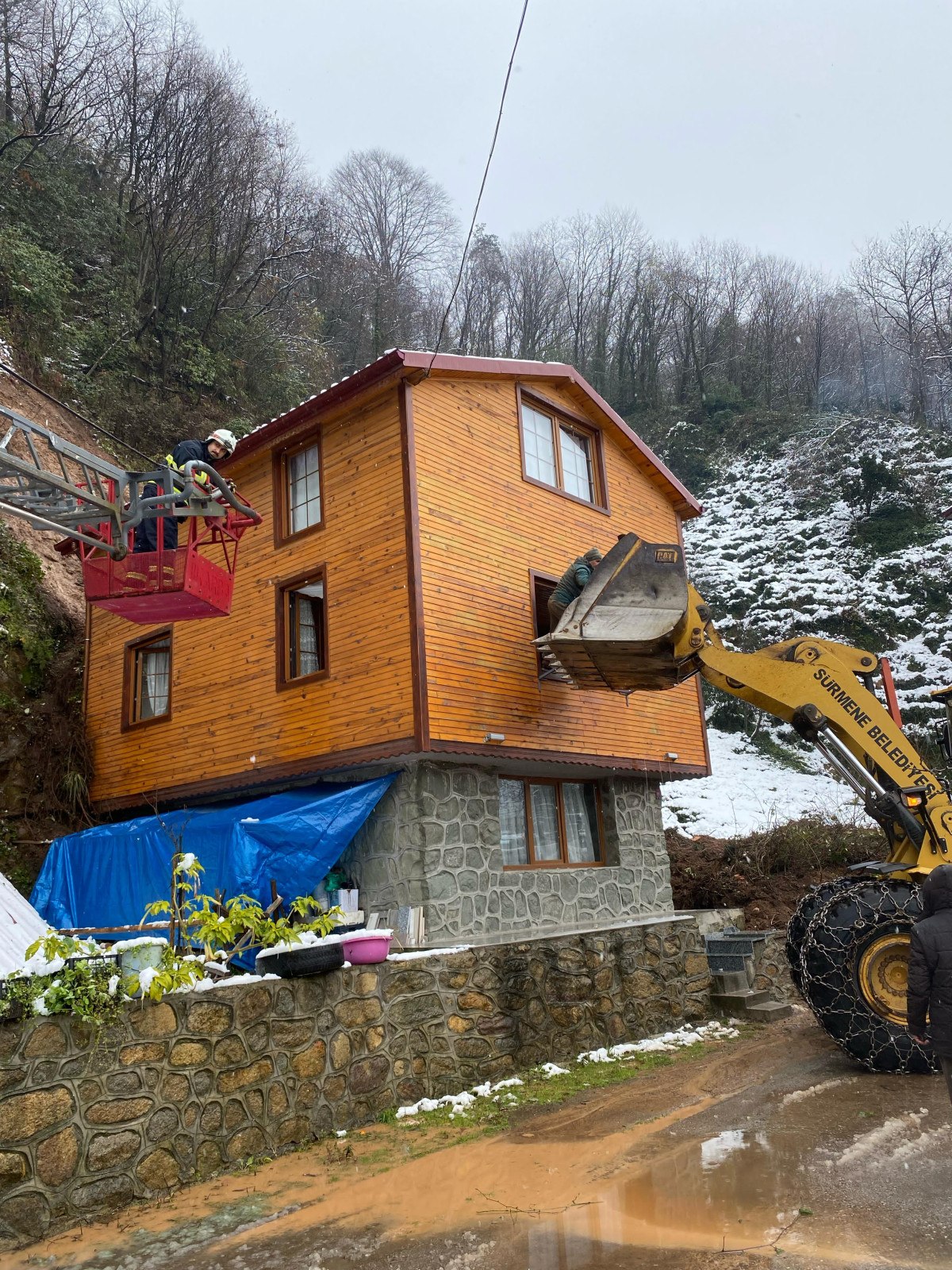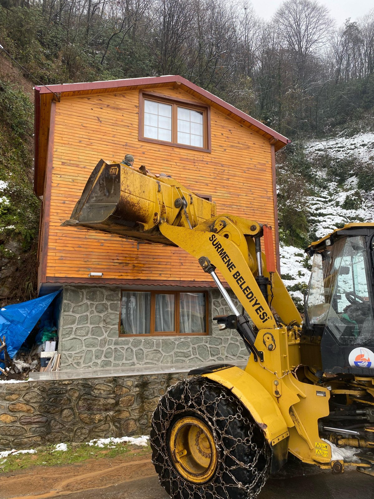 Trabzon’un Sürmene ilçesine bağlı Çarşı Mahallesi’nde, saat 16.00 sıralarında yoğun kar yağışının ardından heyelan meydana geldi. Yamaçtan kopan toprak kütlesi hızla sürüklenerek Necdet Sofuoğlu’na ait iki katlı ahşap evin girişini kapladı.