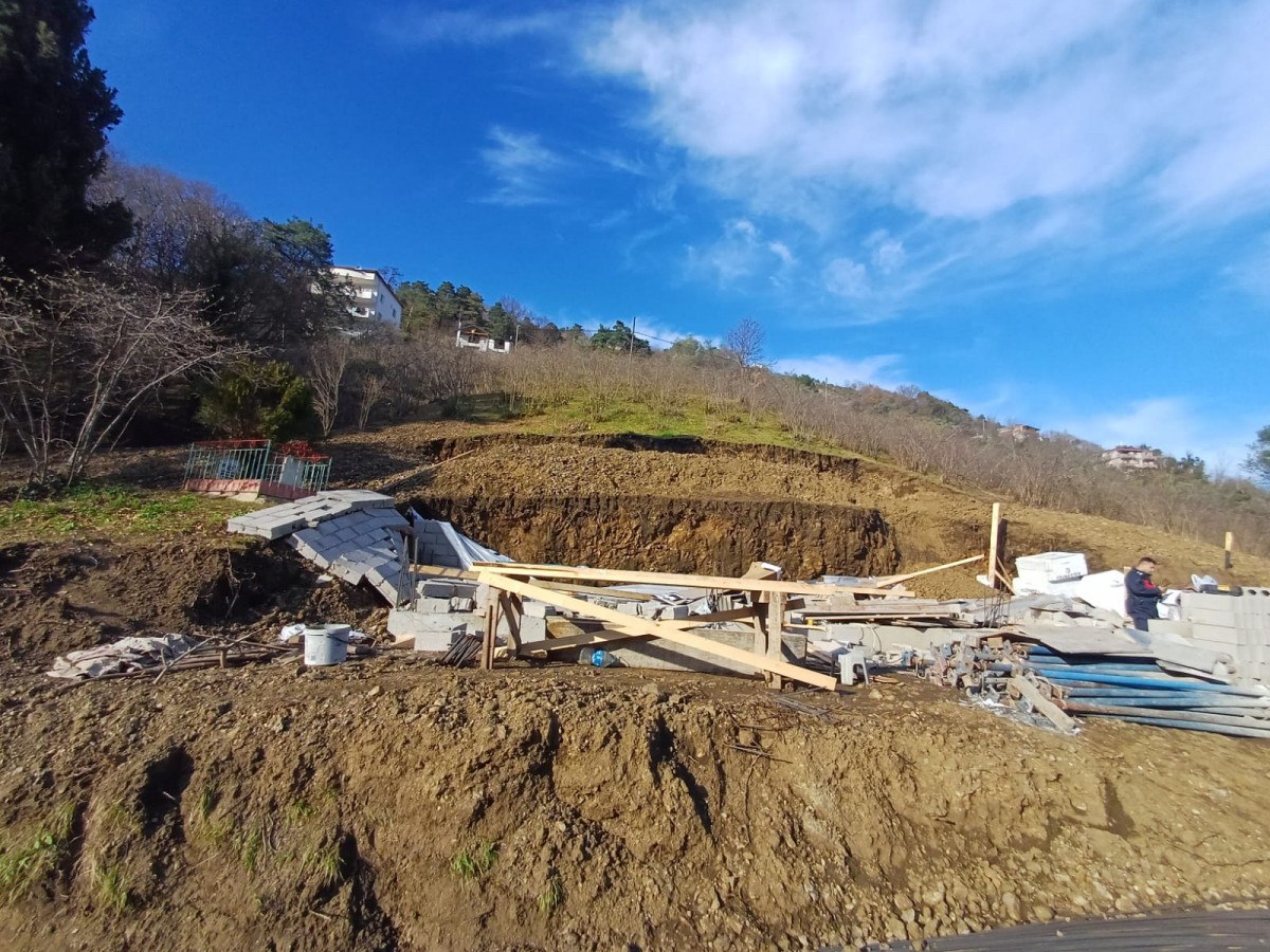 Trabzon’un Akçaabat ilçesi Çamlıdere Mahallesi’nde yapımına başlanan inşaatı çevreleyen yamaç arazi önündeki istinat duvarı çöktü.