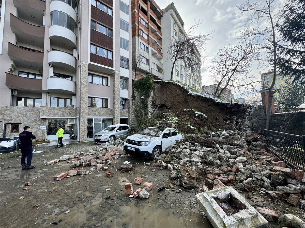 İstinat duvarı olaydan saniyeler önce buradan ayrılan Karslıoğlu’nun aracının yanına park edilen 2 aracın üzerine düştü.