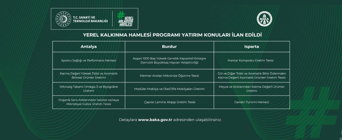 Kütahya’da bakır filmaşin ve endüstriyel akü, Malatya’da kayısı çekirdeğinden katma kıymetli eser, Manisa’da elektronik kart, çağdaş jeotermal sera heyetimi, Mardin’de Asya eriştesi, Mersin’de tekne ve yat, Muğla’da hibrit, elektrikli ve güneş enerjisi destekli etraf dostu deniz araçları üzere mevzularda yatırımlar desteklenecek.
