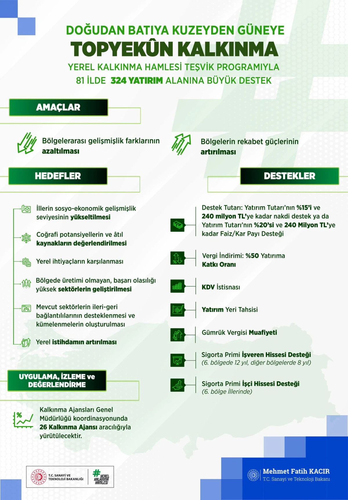 Bölgelerin sektörel öncelikleri dikkate alınarak ilan edilen Lokal Kalkınma Hamlesi Programı ile, lokal ve bölgesel kalkınmanın sağlanması, rekabetçiliğin artırılması, bölge içi ve bölgeler ortası gelişmişlik farklarının azaltılması, atıl kaynakların kullanılması, yetkinliklerin harekete geçirilmesi, mahallî gereksinimlerin karşılanması, teknoloji üretim düzeyinin yükseltilmesi amaçlanıyor.