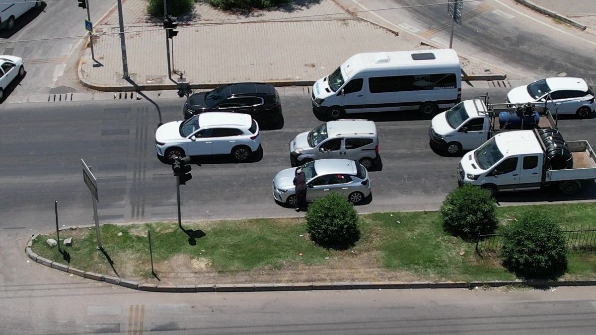 D-400 karayolunda kırmızı ışığın yanmasıyla araçların önüne geçip cam silme mazeretiyle dilenen şahıslar dron ile görüntüledi.