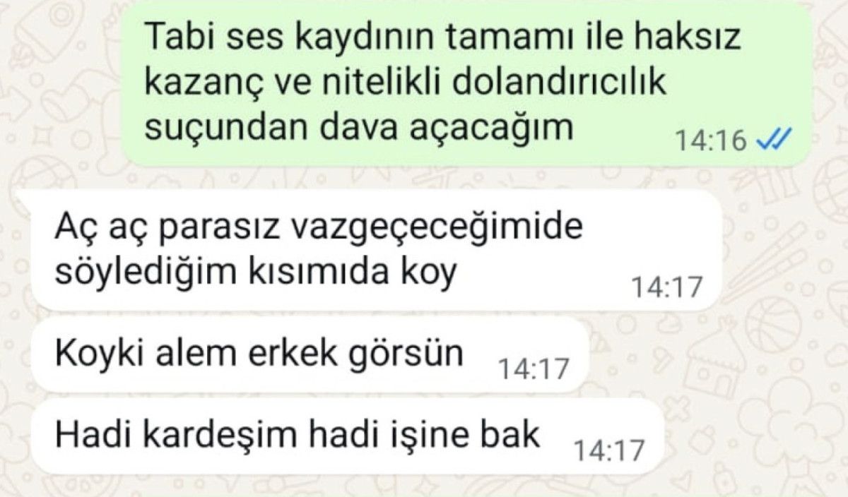 C.S.’ye istediği parayı ödemeyeceğimi söylediğimde davanın uzayacağı ve daha da mağdur olacağımı söyledi. Bu formda 50-100 bireye tıpkı hususta dava açtığını ve para talep ettiğini öğrendim. Bu yolla ihale mafyacılığına başlamışlar. Vatandaşları dolandırma peşindeler. Davayı kazanamayacaklarını biliyorlar.