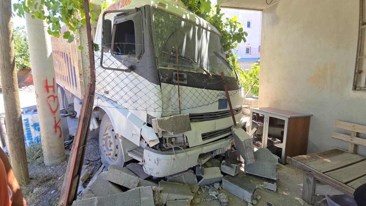 Kontrolün kaybolduğu kamyon, İsmail A.’ya ilişkin konutun bahçe duvarına çarptı.