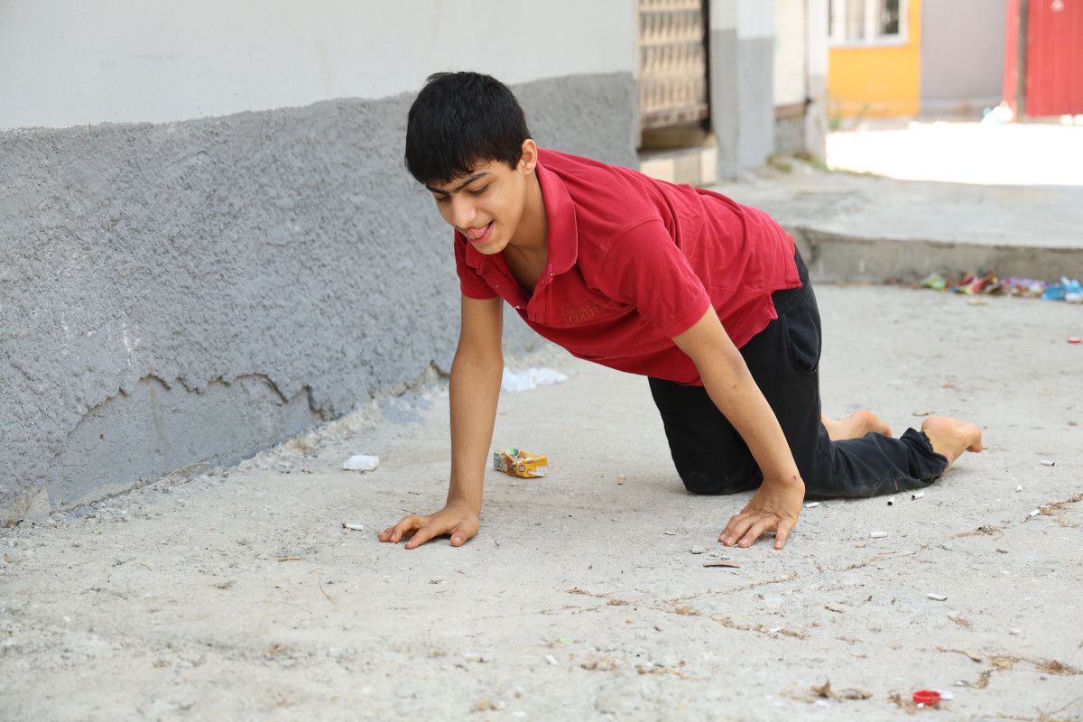 Tek toplumsal aktivitesi tekerlekli sandalyesiyle gezmek olan Enes, artık sokaklarda emekleyerek vaktini geçirmeye başladı.