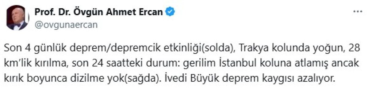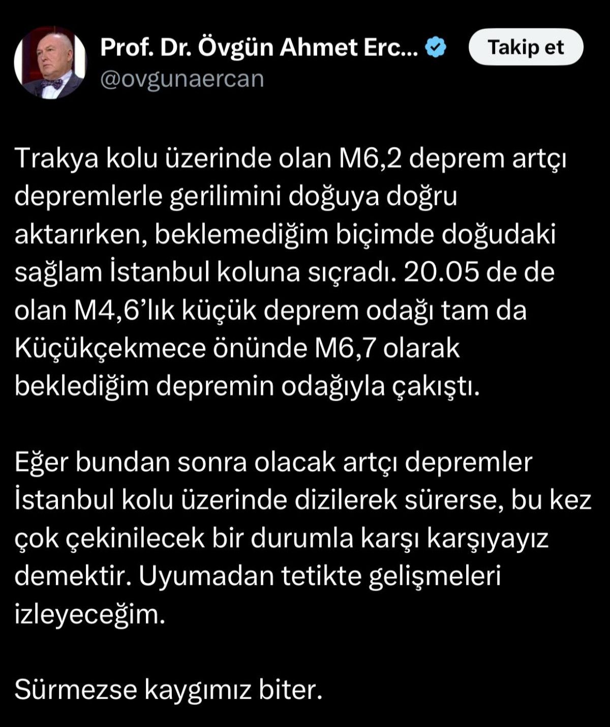 Eğer bundan sonra olacak artçı depremler İstanbul kolu üzerinde dizilerek sürerse, bu kez çok çekinilecek bir durumla karşı karşıyayız demektir. Uyumadan tetikte gelişmeleri izleyeceğim. Sürmezse kaygımız biter.