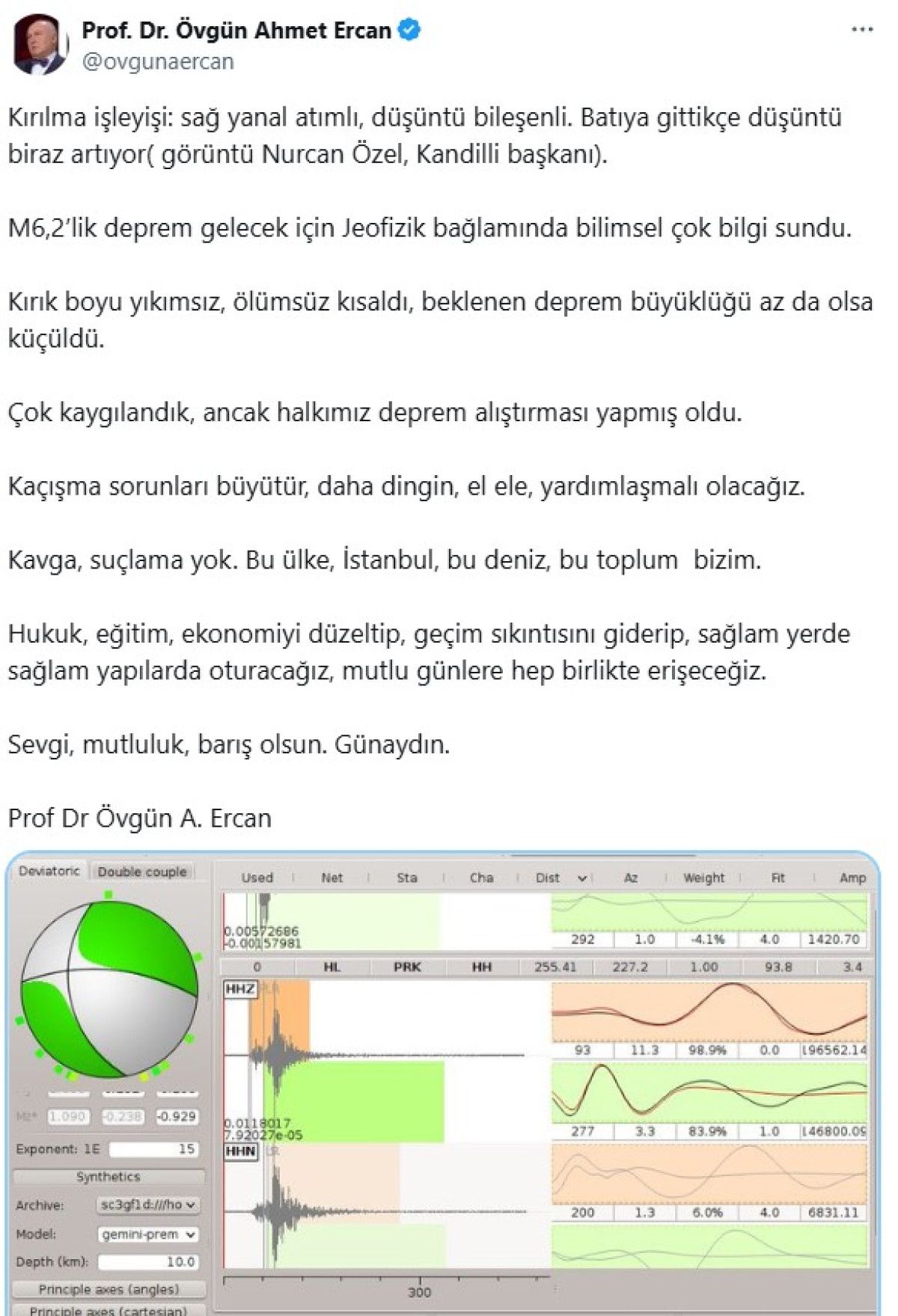 Peş peşe gelen sarsıntıların ardından gözler yeniden uzmanlara çevrildi. Deprem bilimci Prof. Dr. Övgün Ahmet Ercan, artçı depremlerle ilgili dikkat çeken değerlendirmelerde bulundu. Ercan’ın ilk açıklaması 5 milyona yakın görüntülenirken, korkuları artırdı. Ancak saatler ilerledikçe gelen verileri yorumlaryan Ercan, tehlikenin büyük oranda düştüğünü belirtti.