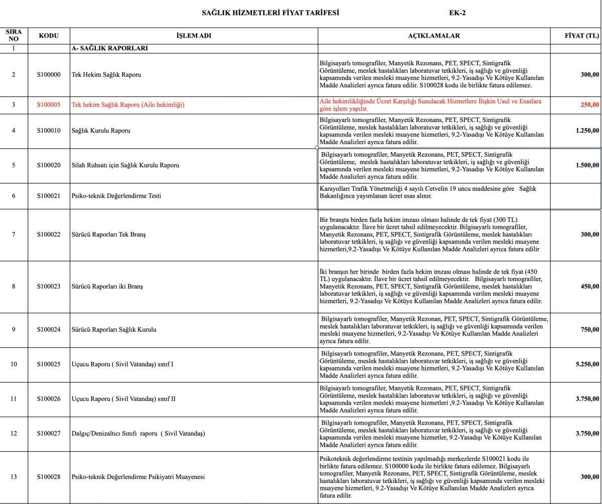 Fiyat Tarifesi’nde de “Tek doktor Sıhhat Raporu (Aile hekimliği): Aile hekimlikliğinde Fiyat Karşılığı Sunulacak Hizmetlere Ait Metot ve Asıllara nazaran süreç yapılır.” denilerek, bu hizmetin karşılığı olarak da 250 lira talep edileceği belirtildi.