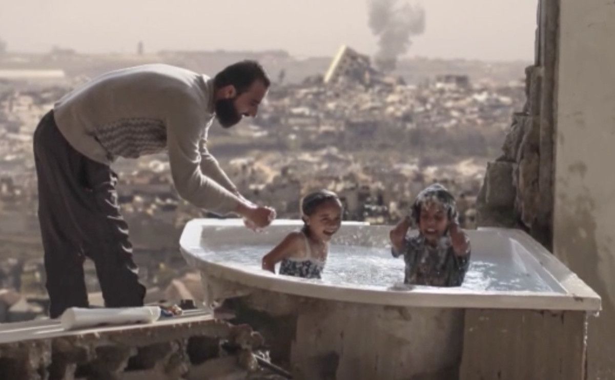 Paylaşılan görüntüde, Gazze’de bir babanın çocuklarıyla verdiği ömür uğraşına dikkat çekildi.