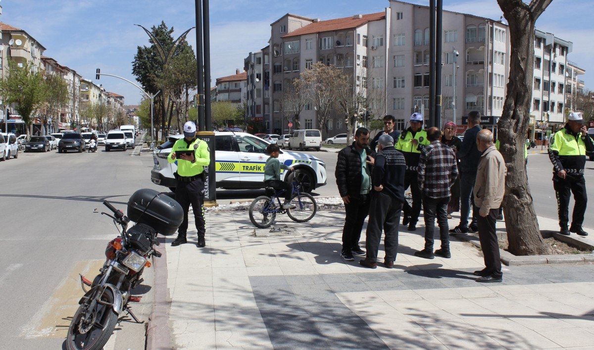 Aksaray’da kurye Efe K. yönetimindeki motosiklet ile Zehra G. yönetimindeki plakasız elektrikli bisiklet çarpıştı.