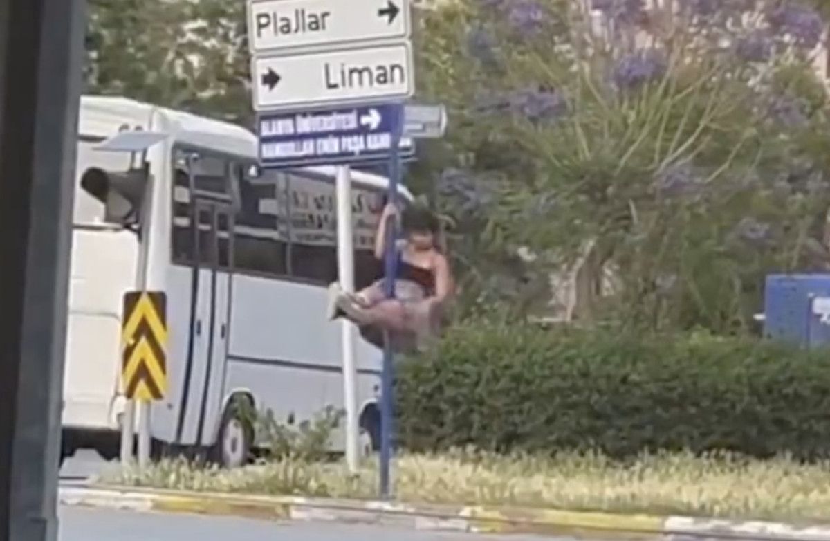 Mini etekle istikamet levhasına çıkan bayan, etrafındakilere aldırmadan direk dansı yaptı.